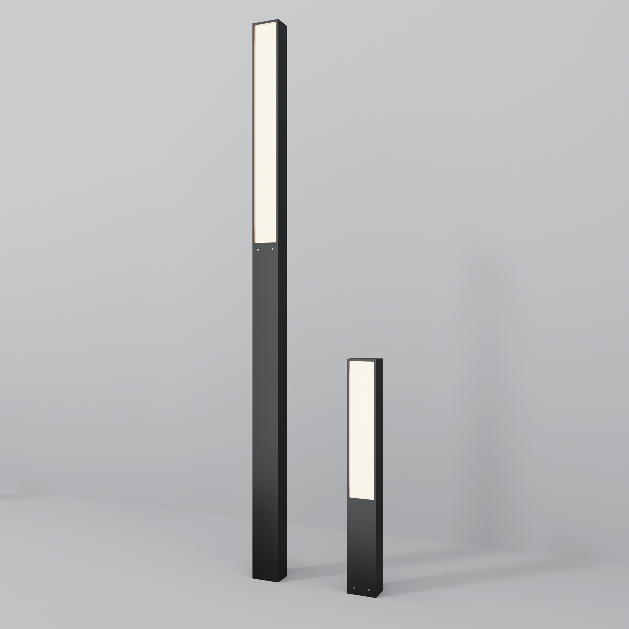 Светильники серии выделяются своими элегантными вытянутыми формами. Высота 1000 мм и 2500 мм создает доминирующее присутствие, идеально подходящее для основного освещения экстерьера.