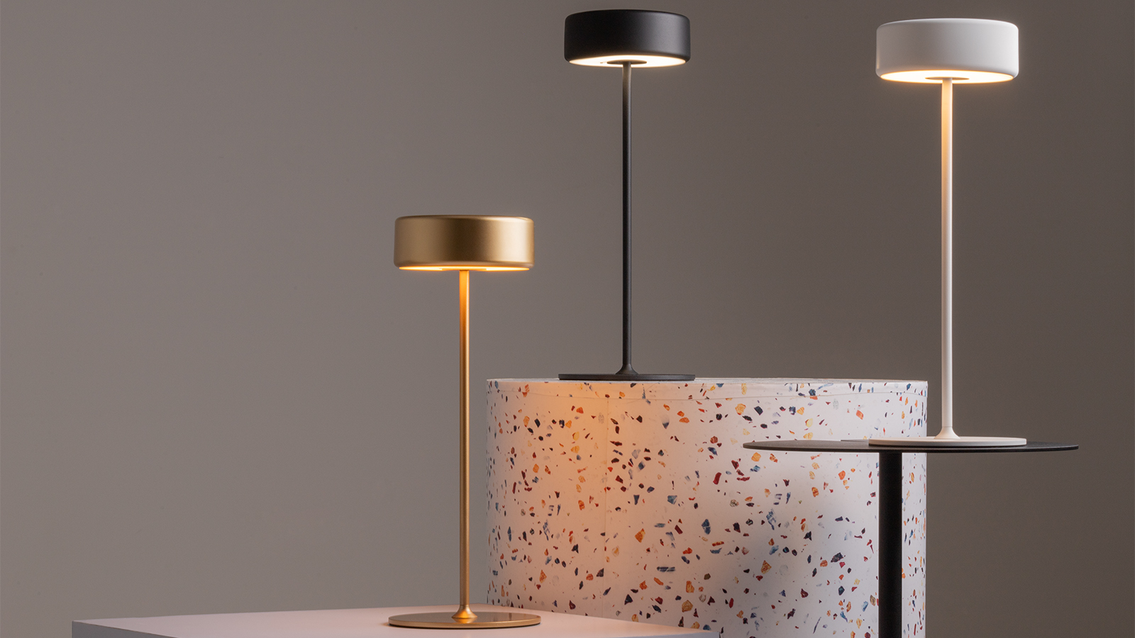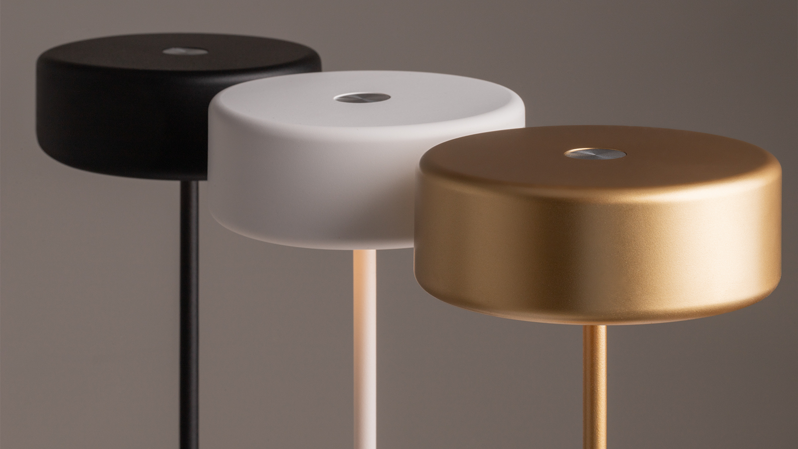 Два варианта корпуса светильника: с металлической тонкой ножкой на плоском круглом основании; со стеклянным основанием с интегрированной вазой. Два варианта цвета стеклянных моделей - прозрачный и серый. Плафоны с рассеивателем из акрила в 3х цветах: черный, золотой, белый.
