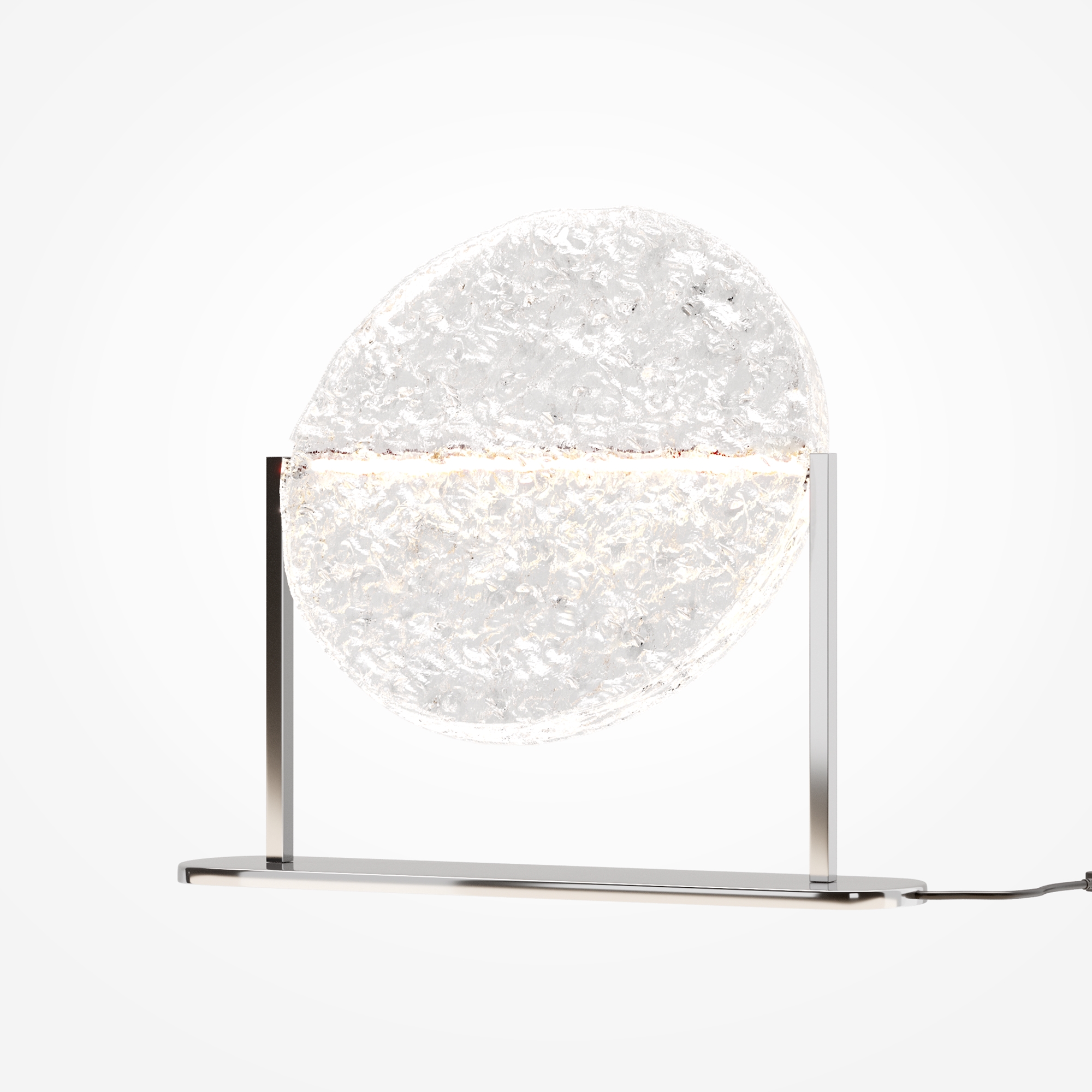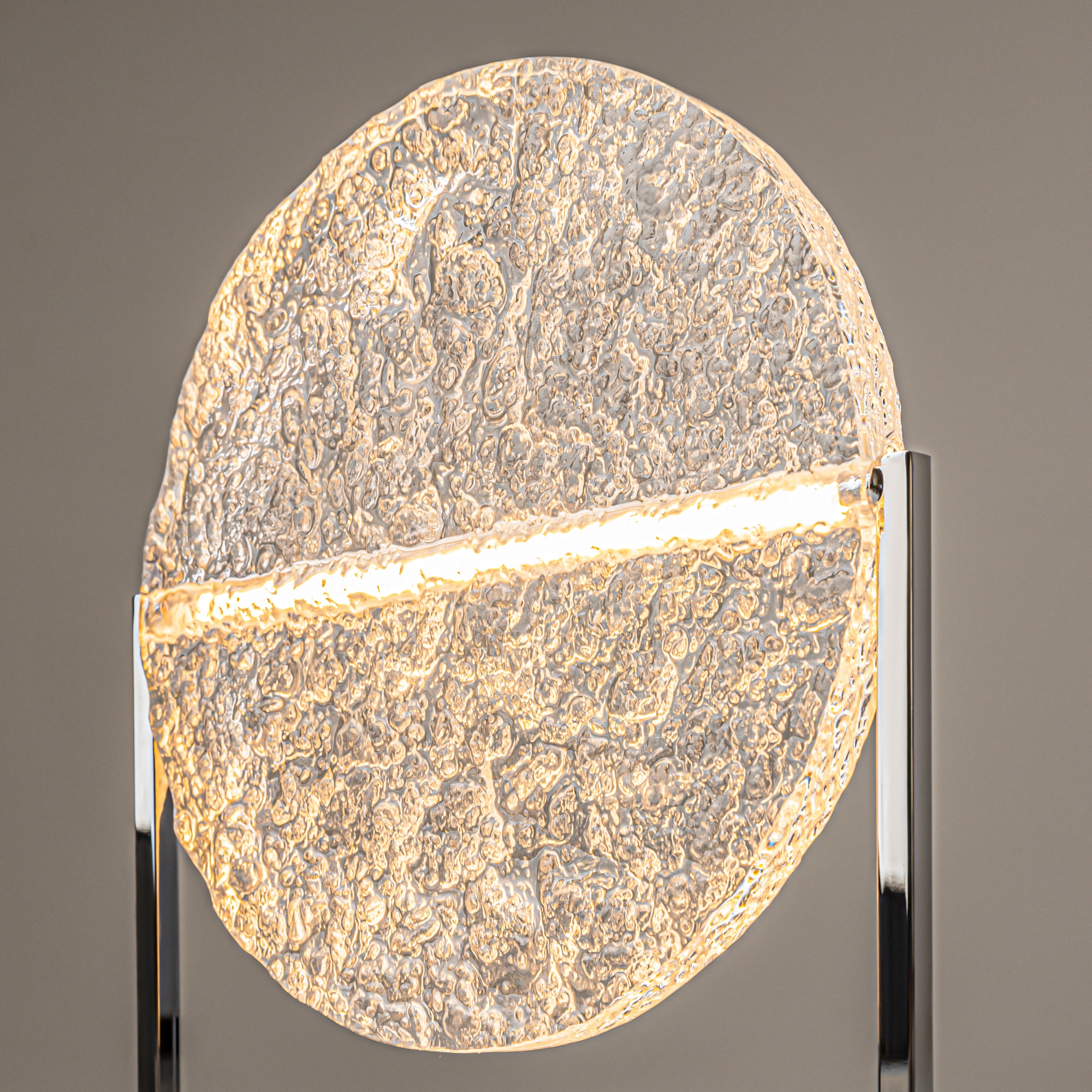 Сочетание хромированного металлического основания и текстурного акрила создает баланс между современными технологиями и природной эстетикой.