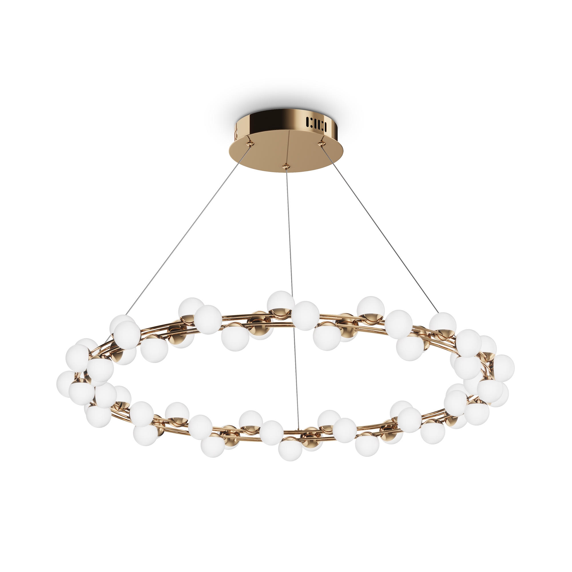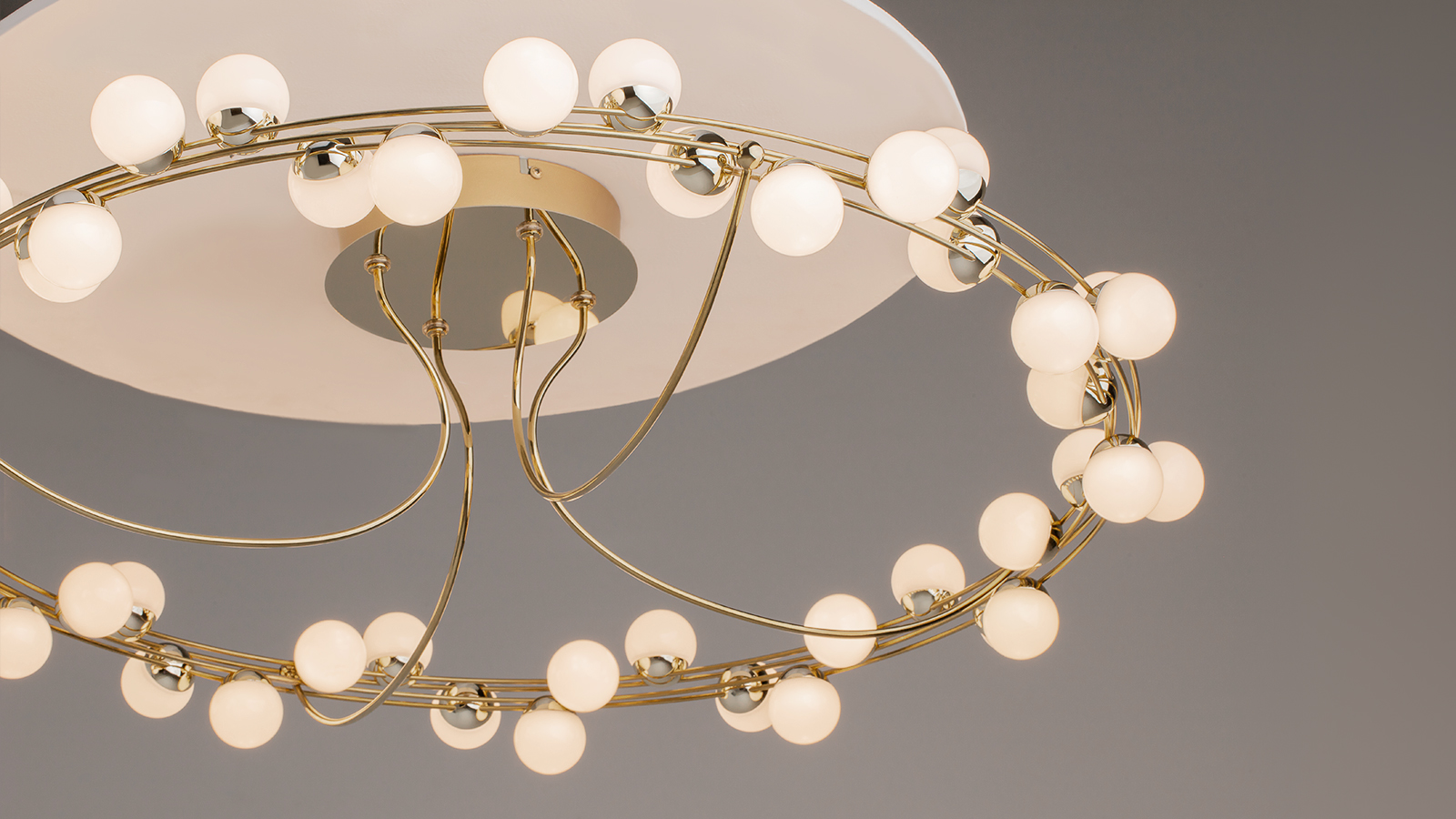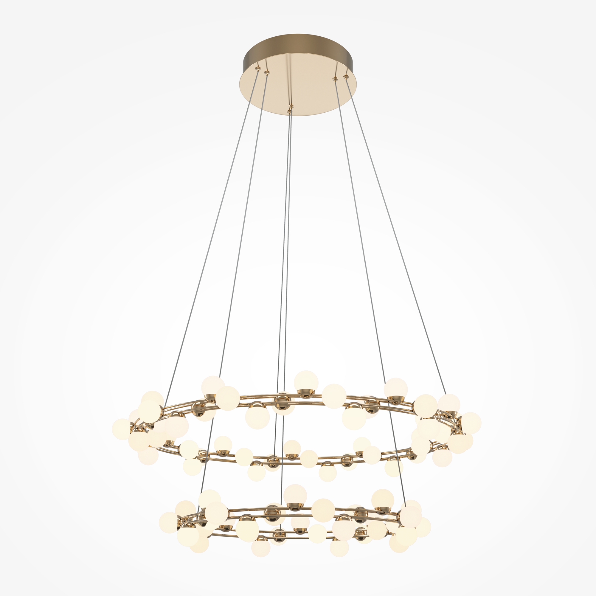 Одна из характерных черт подобных светильников — невесомость конструкции. За счет тонких, практически невидимых тросов, которые регулируются по высоте, создается ощущение, что люстра парит в воздухе. Металлическая золотая арматура и матово-белые миниатюрные плафоны с легкостью дополнят любую палитру, а представленные в коллекции подвесная люстра и бра станут готовым ансамблем для освещения гостиной, спальни, прихожей. В серии представлены потолочные светильники разных диаметров, подвесные на 1 и 2 яруса, настольный и настенный светильники. LED источник света, цветовая температура - 3000К.
