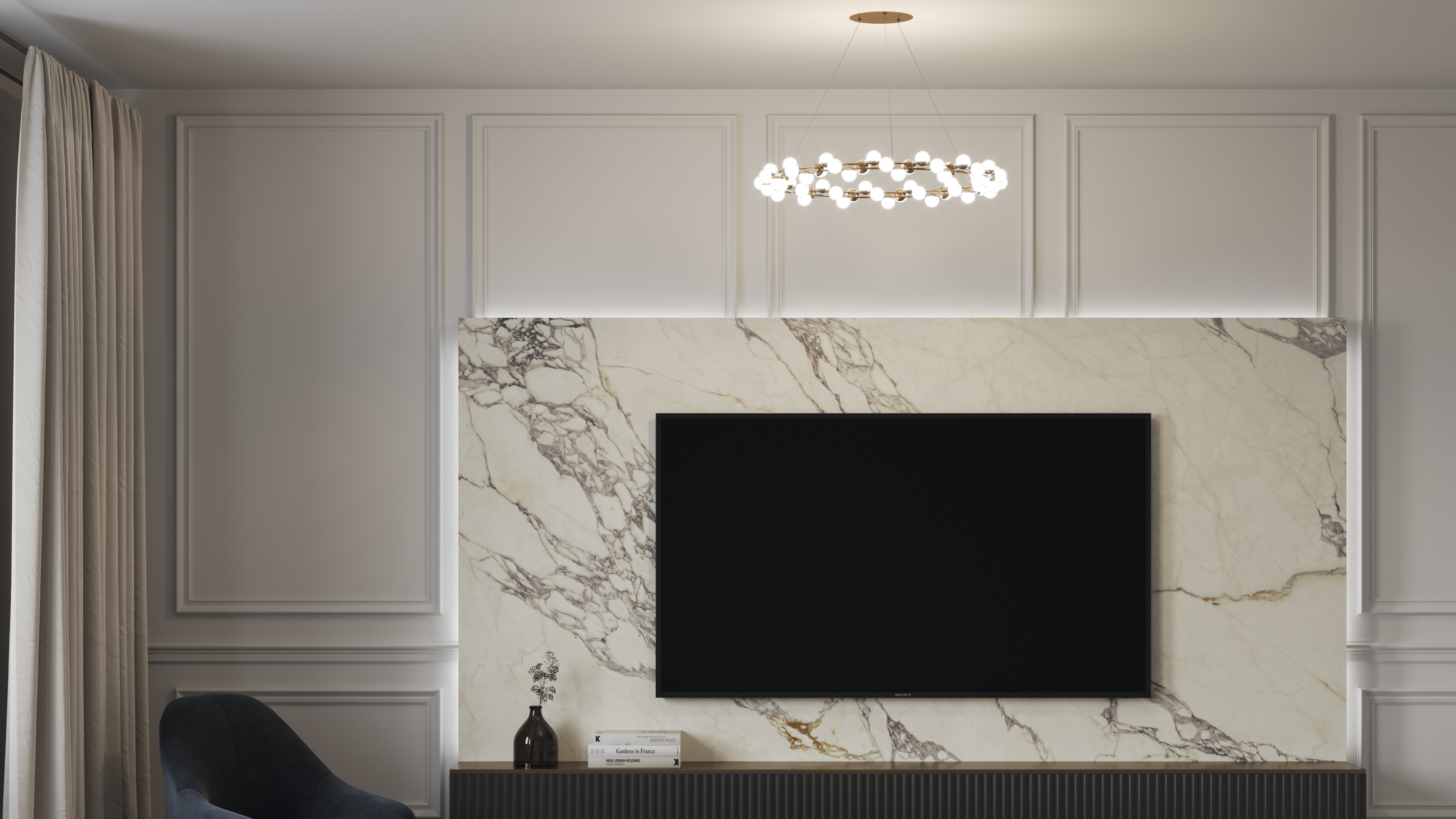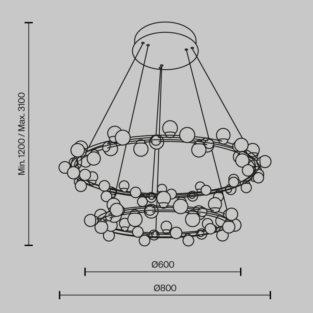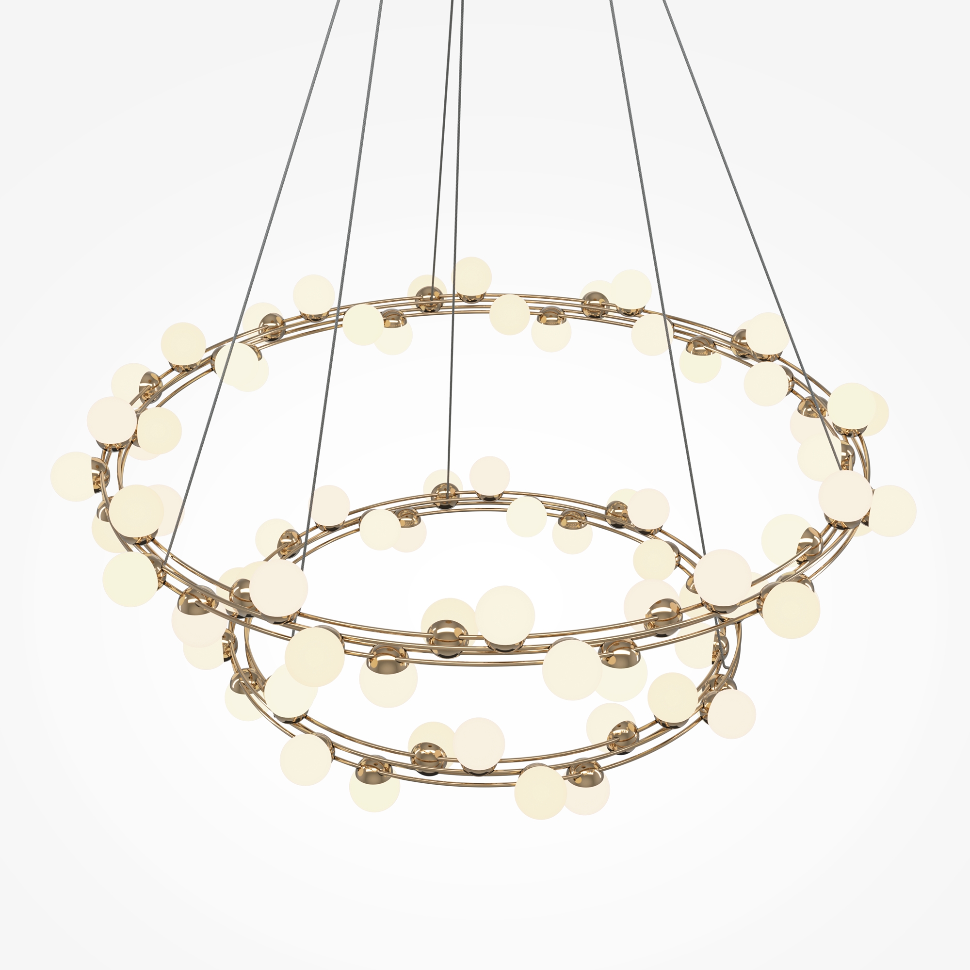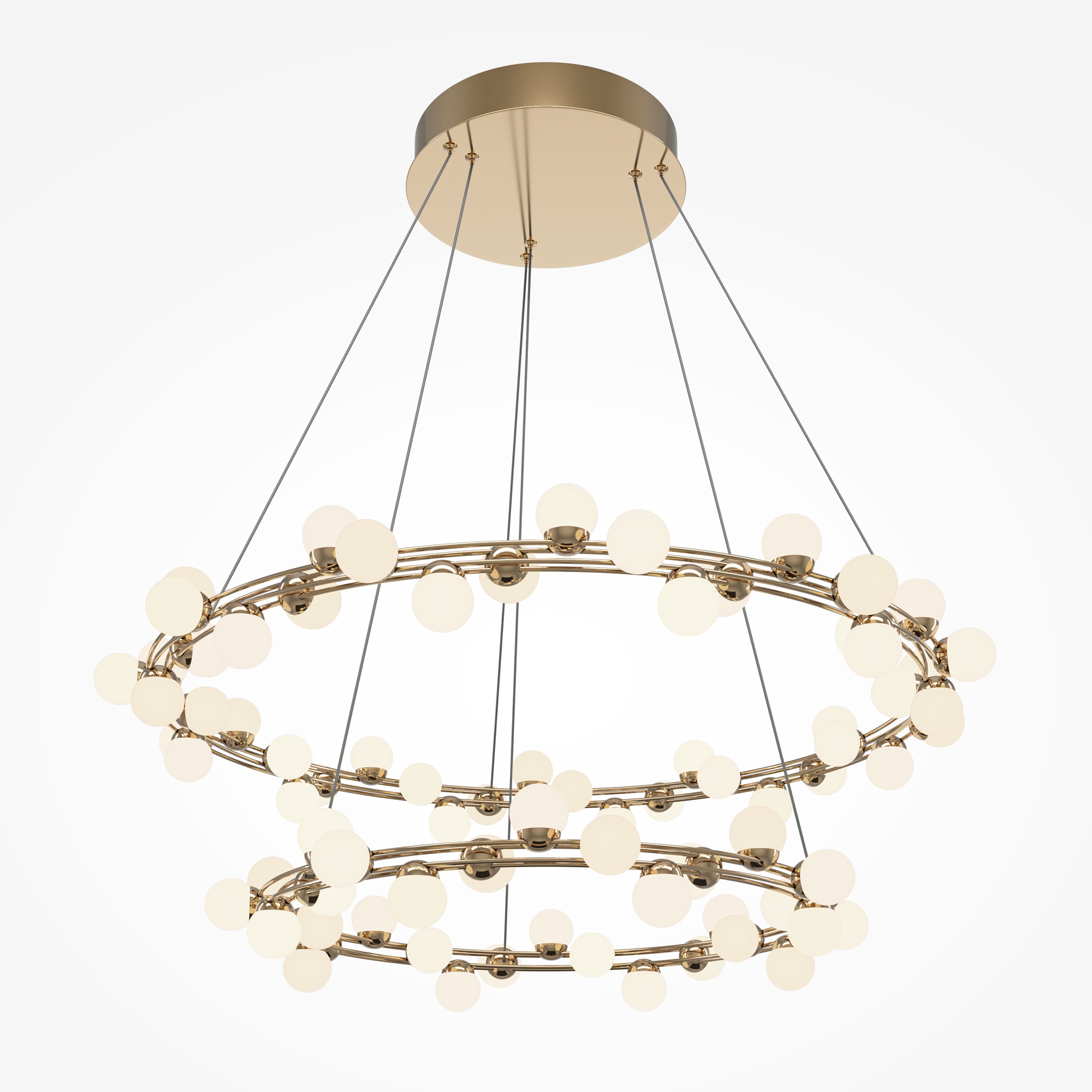Одна из характерных черт подобных светильников — невесомость конструкции. За счет тонких, практически невидимых тросов, которые регулируются по высоте, создается ощущение, что люстра парит в воздухе. Металлическая золотая арматура и матово-белые миниатюрные плафоны с легкостью дополнят любую палитру, а представленные в коллекции подвесная люстра и бра станут готовым ансамблем для освещения гостиной, спальни, прихожей. В серии представлены потолочные светильники разных диаметров, подвесные на 1 и 2 яруса, настольный и настенный светильники. LED источник света, цветовая температура - 3000К.