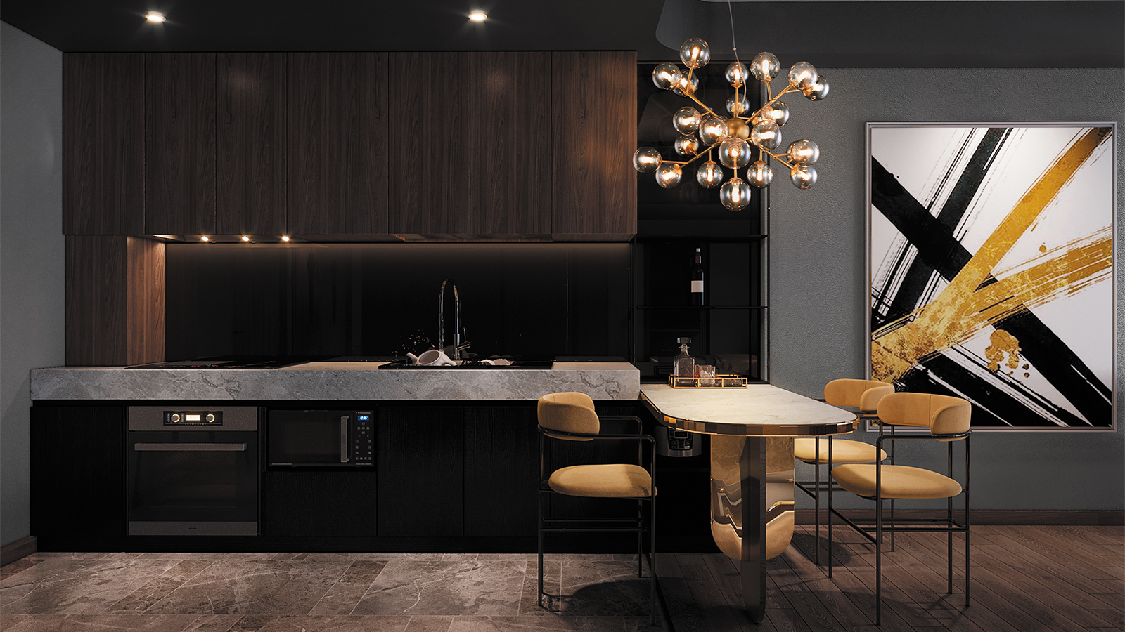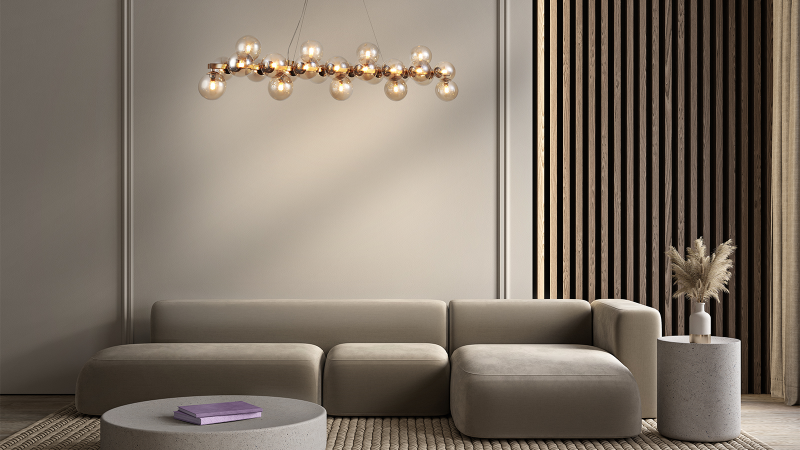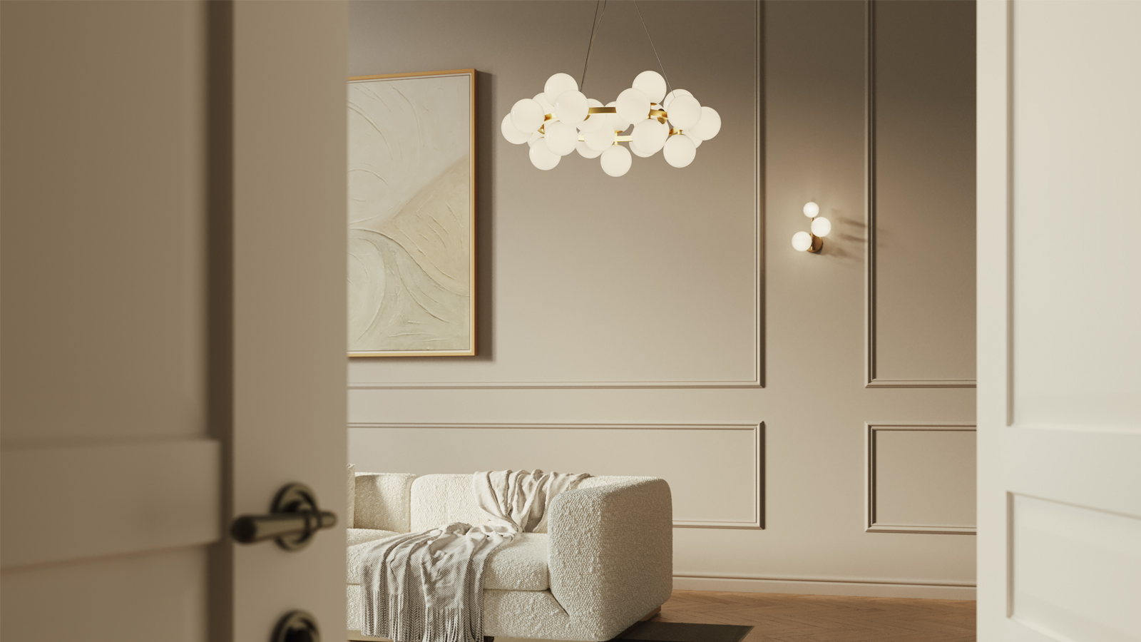 Масштабные скульптурные композиции, образованные многочисленными шарами из выдувного стекла, формируют неповторимый облик светильников серии. На полированных металлических ветвях установлены тонированные плафоны, которые мягко рассеивают и приглушают свет ламп. Модели серии представлены в трех цветах: золото, хром и латунь. Высота подвесных светильников регулируется длиной троса. Серия представлена потолочными, подвесными светильниками, и бра.